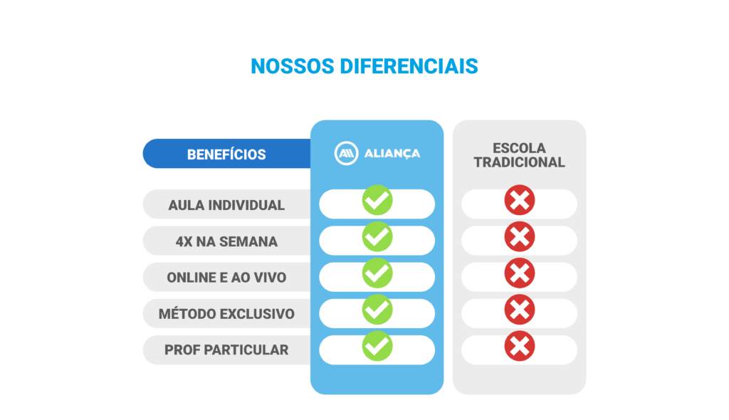 O programa da Aliança prevê 4 aulas semanais. Mas dependendo da necessidade do aluno poderão ser acrescentadas aulas adicionais no plano.